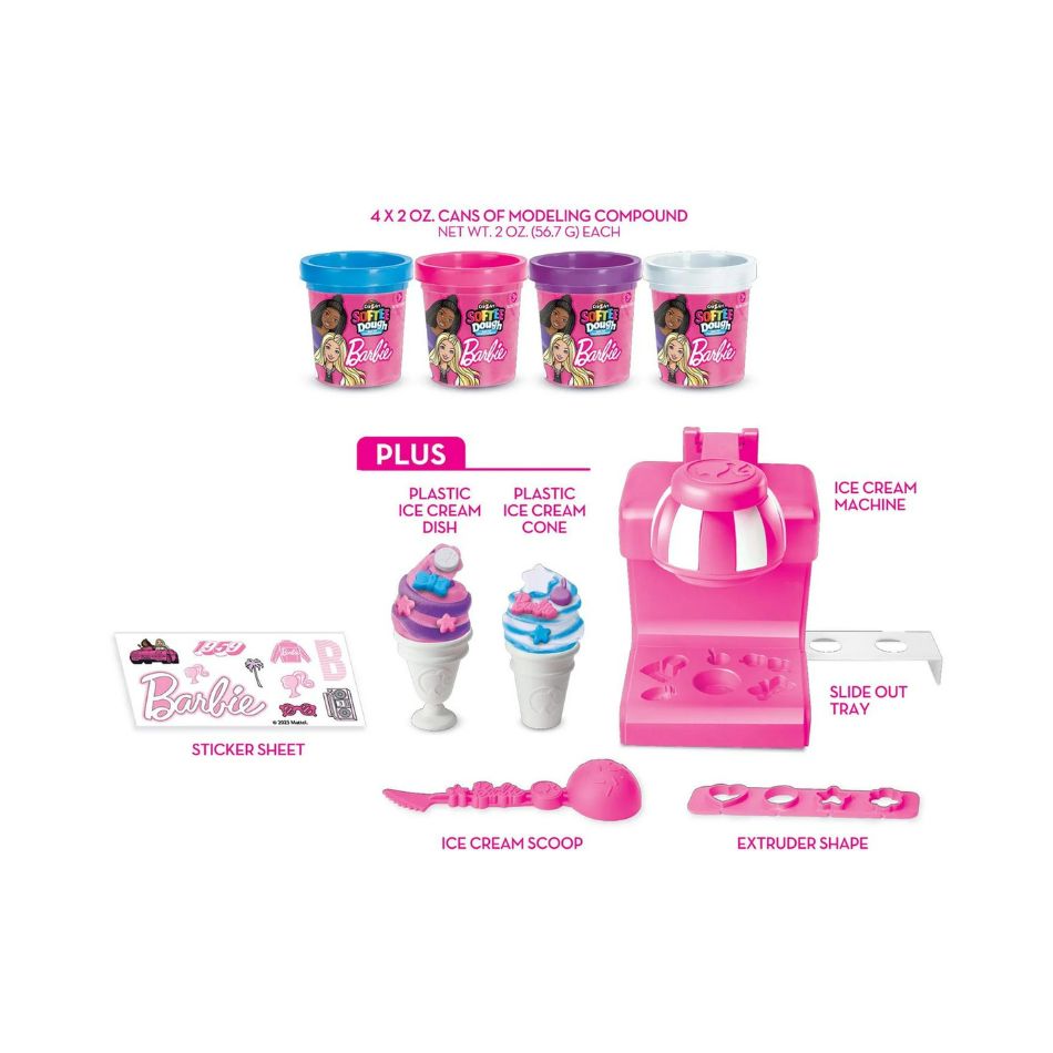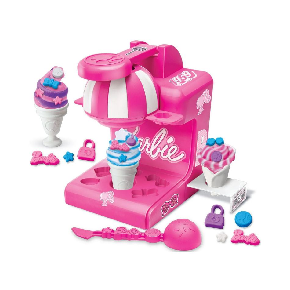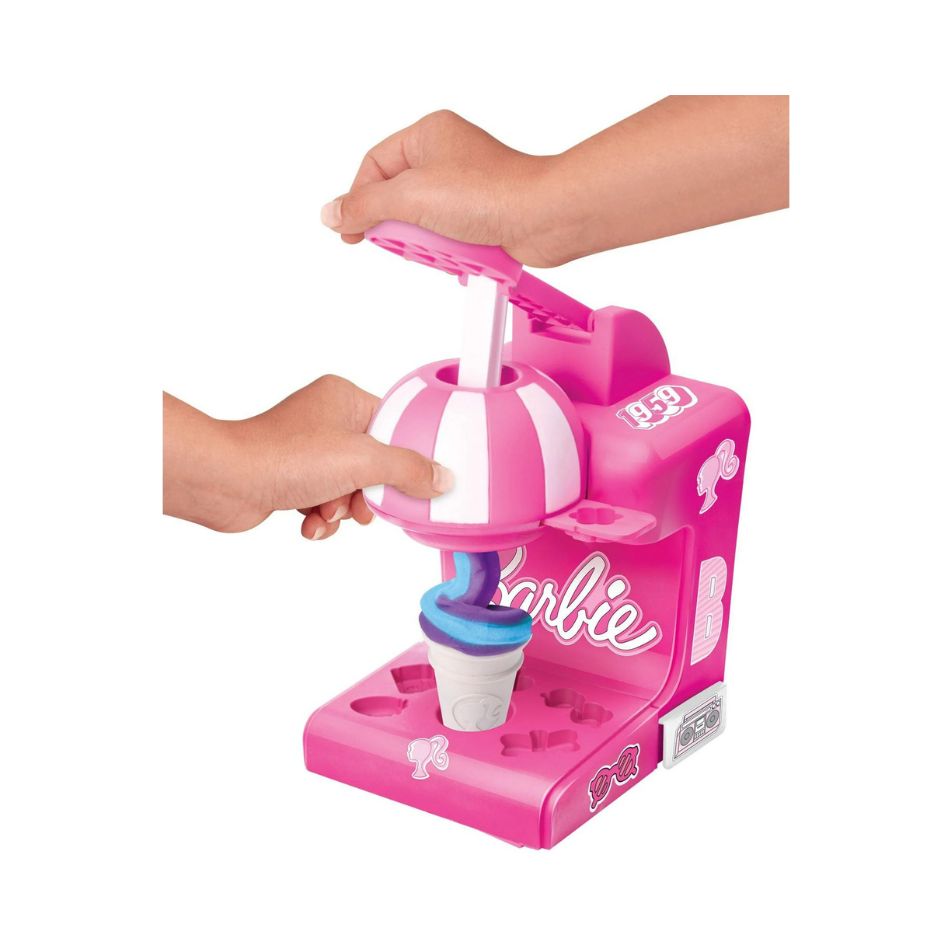 Barbie Softee Dough Ice Cream Shop playset comes with an Ice Cream and Milkshake Maker packed with modeling compound press molds