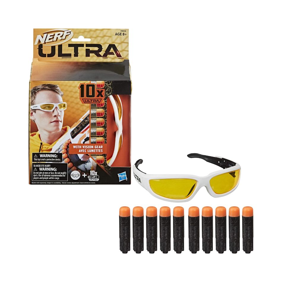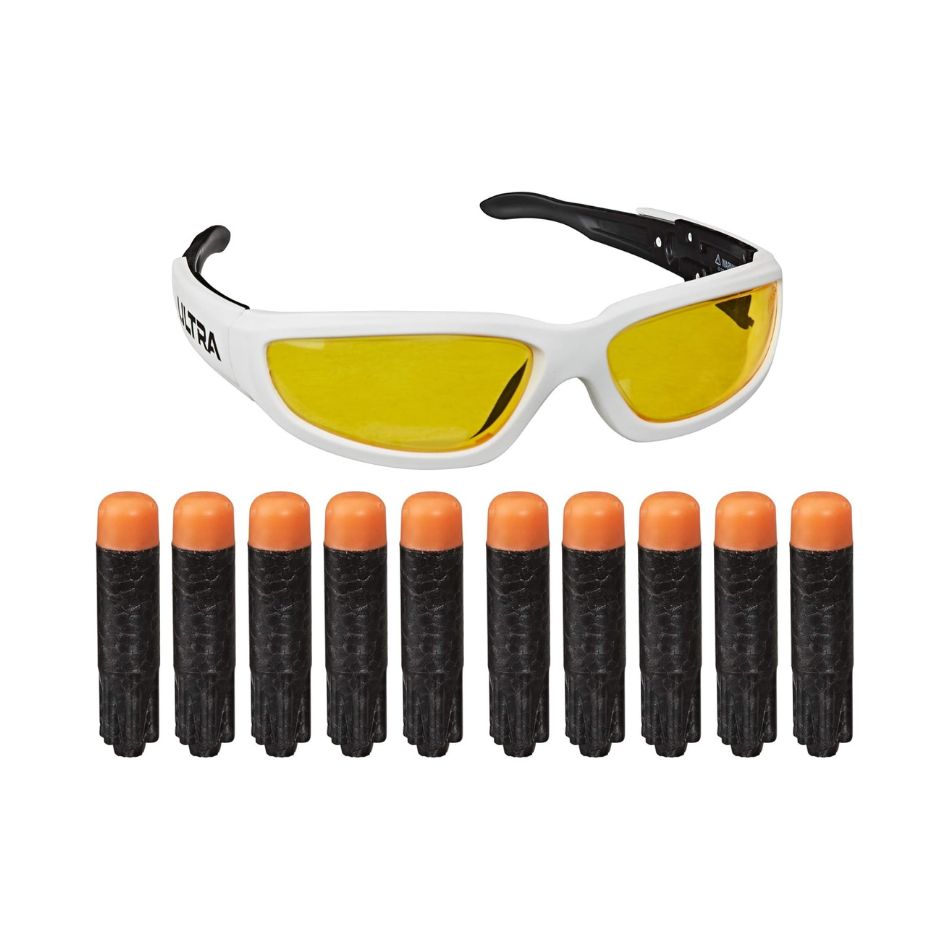 The package includes 10 authentic Nerf Ultra darts, built for maximum performance and accuracy, as well as glasses with yellow lenses for style and better visibility during battle.