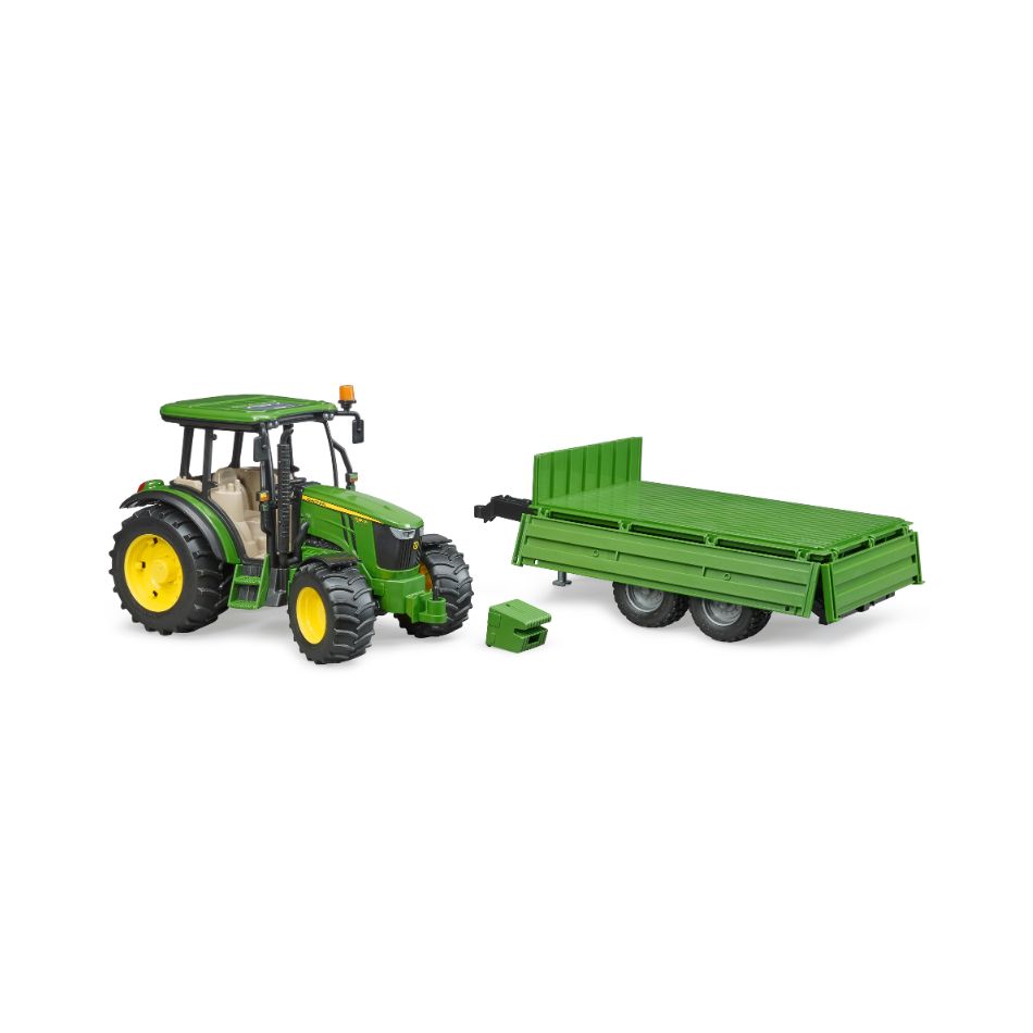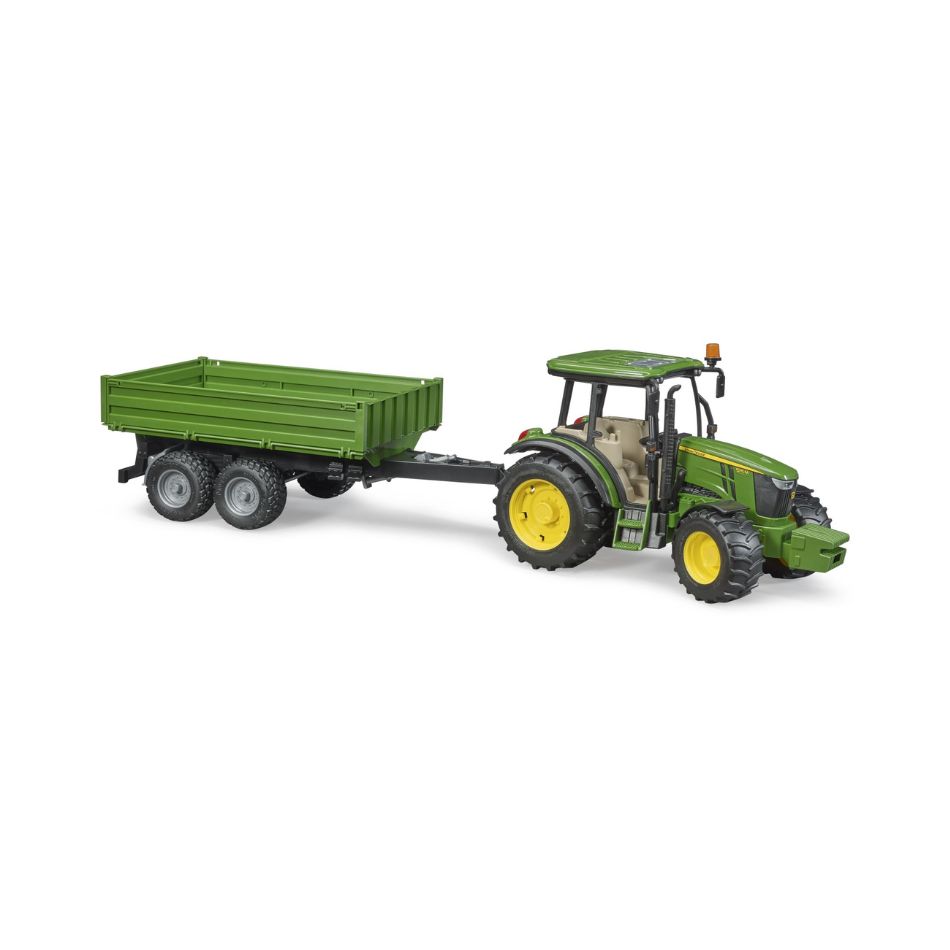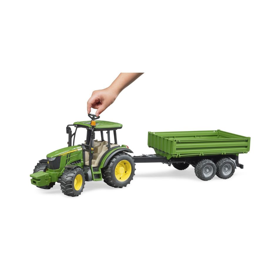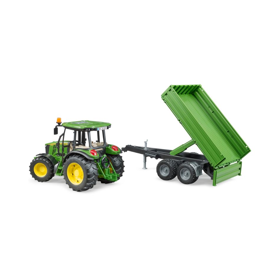 The John Deere 5115M is the star of the compact tractor class on the farm. The large cab is stands out with plenty of space for drivers to move. Powerful and efficient engine. Versatility is its special feature. Regardless of whether the tractor is transporting goods on-road or it is being used with attachments on the field, the performance of this tractor will always confirm you made the right choice. The toy is no different. As usual, model-type design linked with durability and versatile functions make it compatible with the vast range of BRUDER agricultural units. Its steering makes it agile and an additional drag link allows steering through the sliding roof, just like the big BRUDER models. The tandem-axle trailer is the ideal companion with its tilting platform and fold-down side gates. This appealing and competitively priced tractor and tandem transport trailer is the ideal addition to bworld theme worlds.