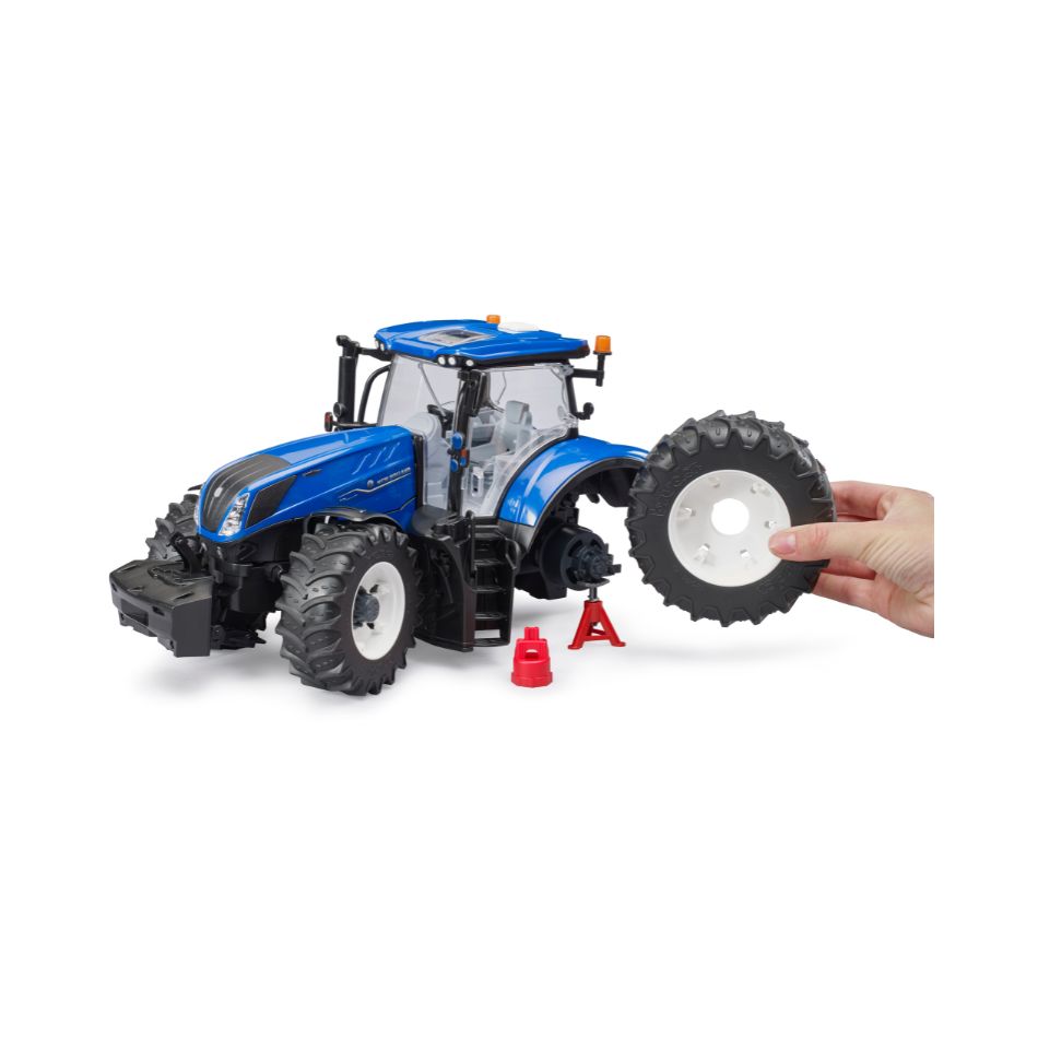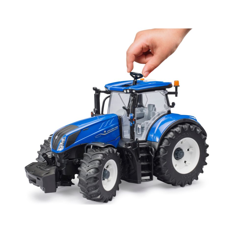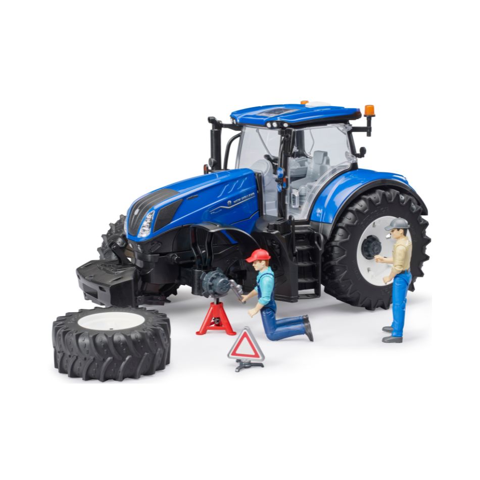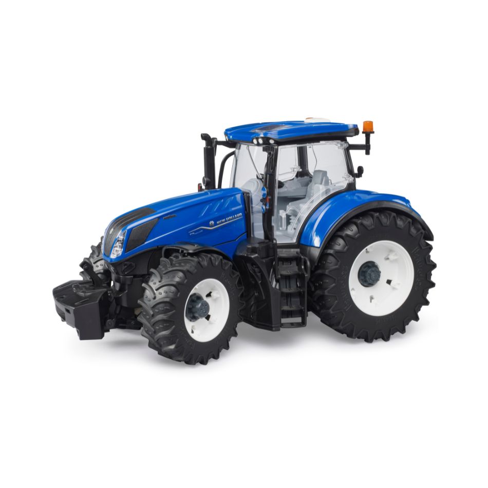 Modern farms require strong tractors. For this reason, New Holland developed the T7 Heavy Duty model series with a focus on flexibility and power. The New Holland tractor generates 340 hp to operate heavy-duty equipment. Consequently, the tractor is strong enough for pulling, soil processing, pressing bails and transport. In terms of design, functionality and quality the new BRUDER model at a scale of 1:16 owns up to it all, in line with the company’s motto “just like the real thing”. The cab is fully glazed and features easy-to-open doors. The folding bonnet provides access to the impressive engine. Excellent handling and ride comfort thanks to the installed oscillating axle as well as the steering wheel extension that is inserted through the roof. Enhance the model and attach a slip-on front loader (item no. 03333). The height-adjustable rear coupling is compatible with all Professional series trailers. The new, detachable wheels add to the fun. Enhance this great toy’s value even more by adding the Workshop figure set (item no. 62100). It goes without saying that all BRUDER agricultural trailers and equipment are compatible with this tractor.