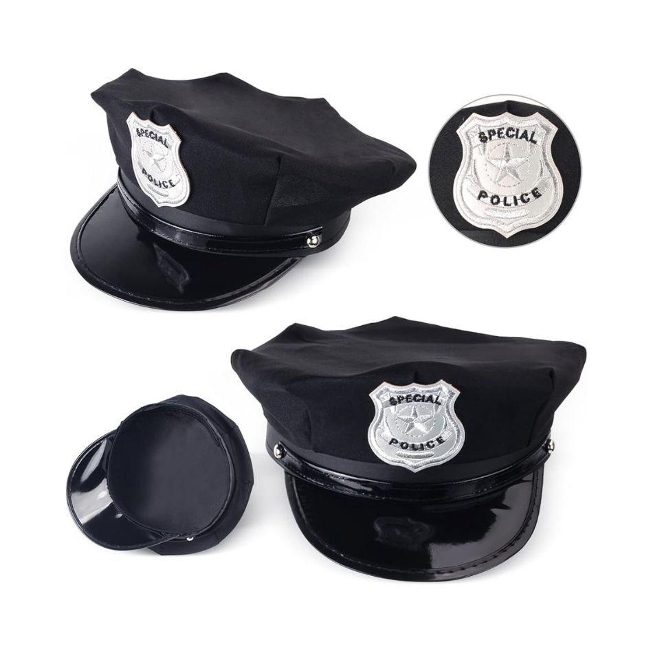 Complete your outfit with this classic police hat, ideal for Halloween and themed appearances. The timeless black design, combined with the metallic badge on the front, gives an authentic style of the uniform and makes the look instantly recognizable.