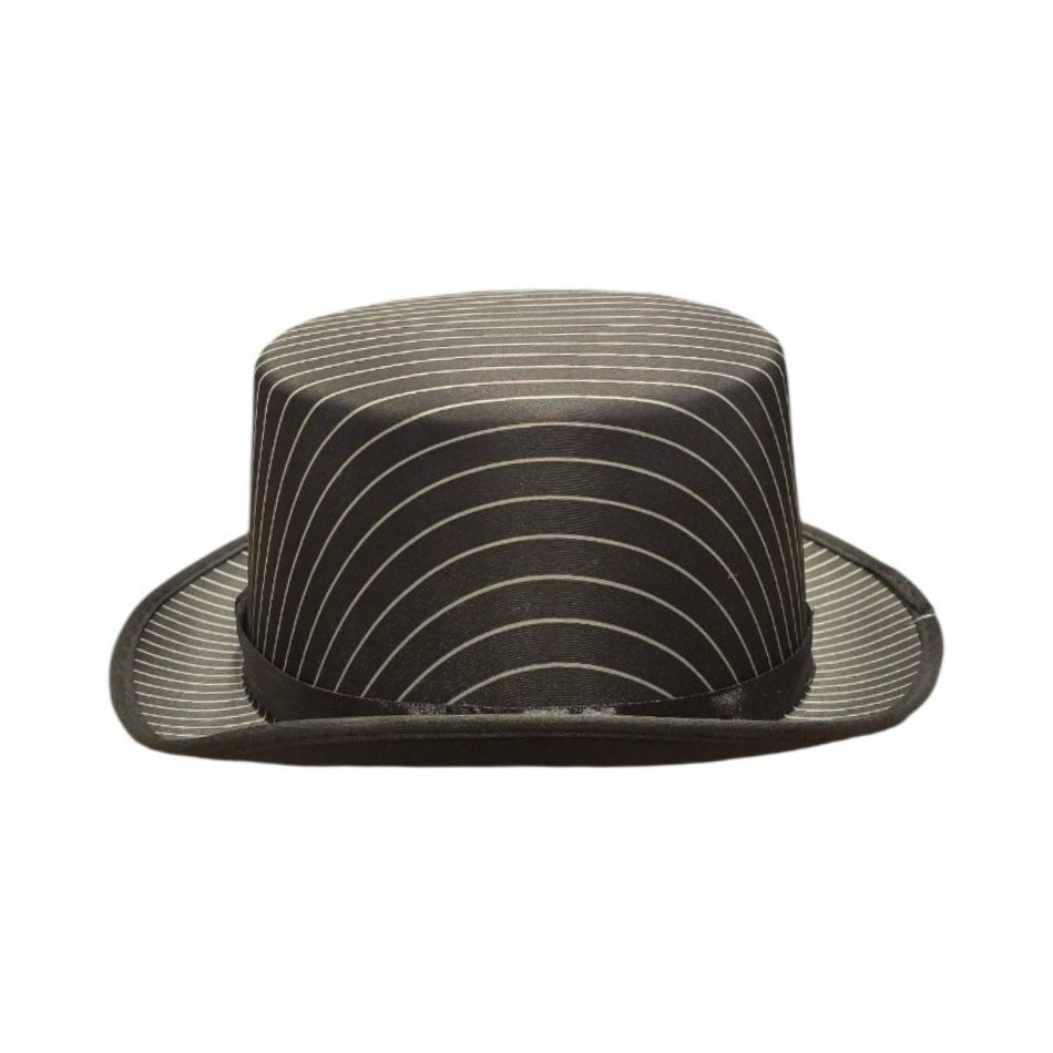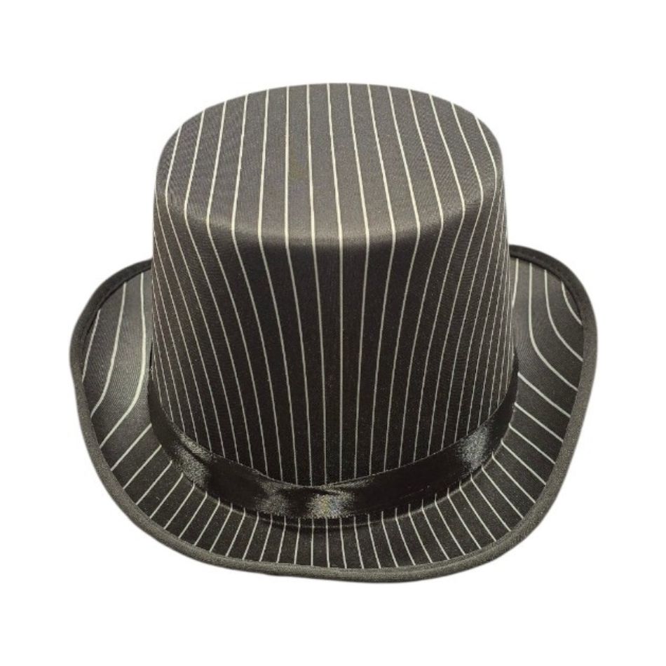 Classic top hat in black with thin white stripes, for an elegant and unique style. Ideal for Halloween, theme parties, theatrical performances and photo shoots.
