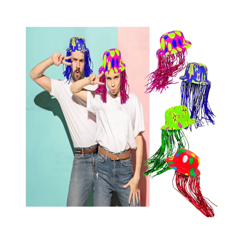 Add color, movement and a crazy mood to the party with these impressive Halloween hats! Available in bright color combinations and playful designs, they are accompanied by long colorful fringes that move with every step, creating a unique effect.