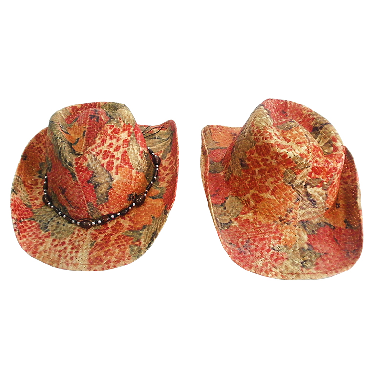Add a western touch to your look with this cowboy hat with a floral design in earthy and red tones. Its unique pattern gives a vintage aesthetic, while the decorative beaded cord at the base of the crown completes the style.