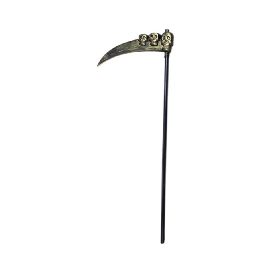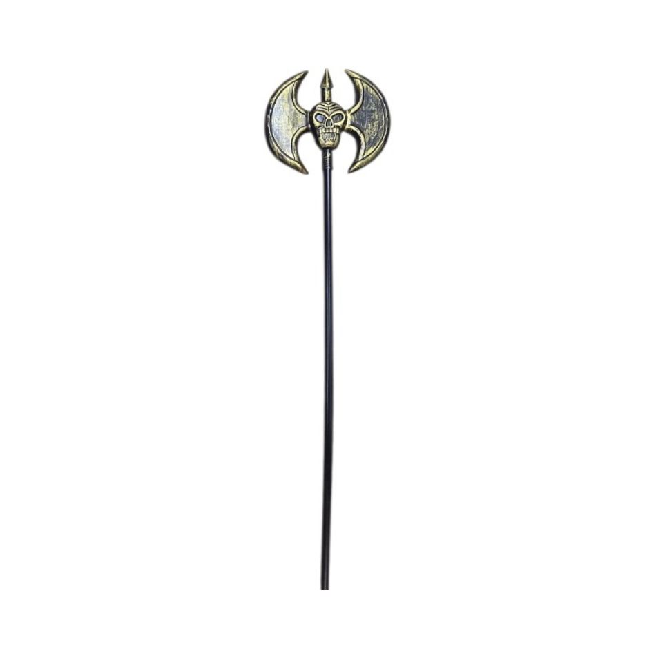 Add an epic and dark vibe to your outfit with this impressive fantasy polearm set. Skull designs, double axes, and scythe-like blades create a highly theatrical and terrifying look, perfect for fantasy and horror characters. The aged gold details on the heads are combined with black poles, offering a realistic look without being heavy or dangerous.