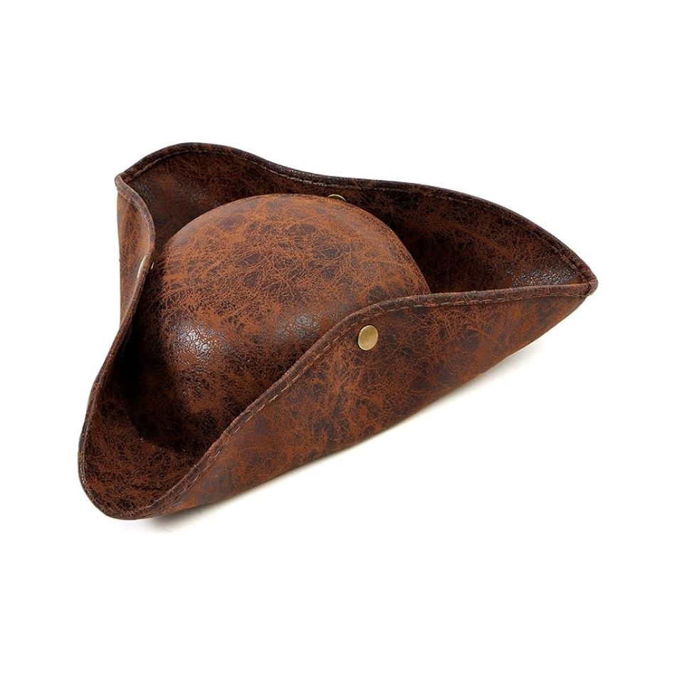 Made of leatherette with an aged finish, it features a characteristic triangular shape with a brim folded in three places and discreet metal buttons that enhance the retro style. It is lightweight and comfortable to wear, so it can be easily worn for many hours at events or performances.
