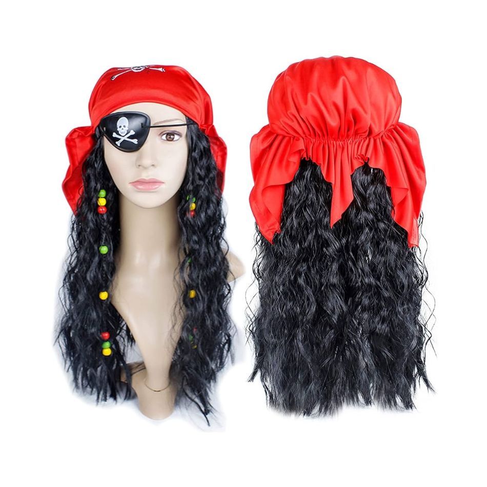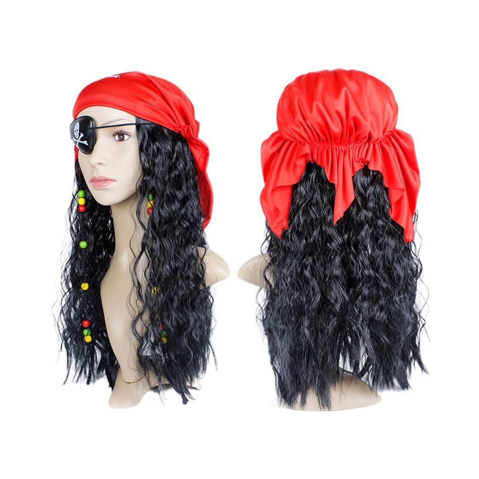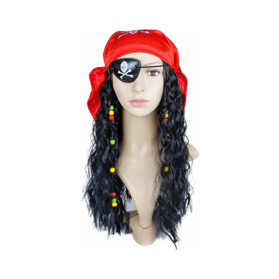 Transform yourself into a fearless pirate with this impressive Halloween set. Includes a long black wig with wavy hair and colorful beads, a red bandana with a skull pattern and a black eye patch with a pirate emblem. Ideal for Halloween, themed parties, school events and theatrical performances.