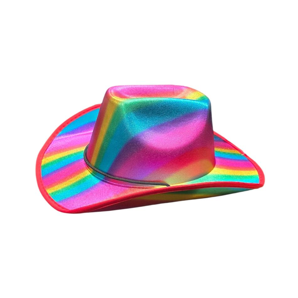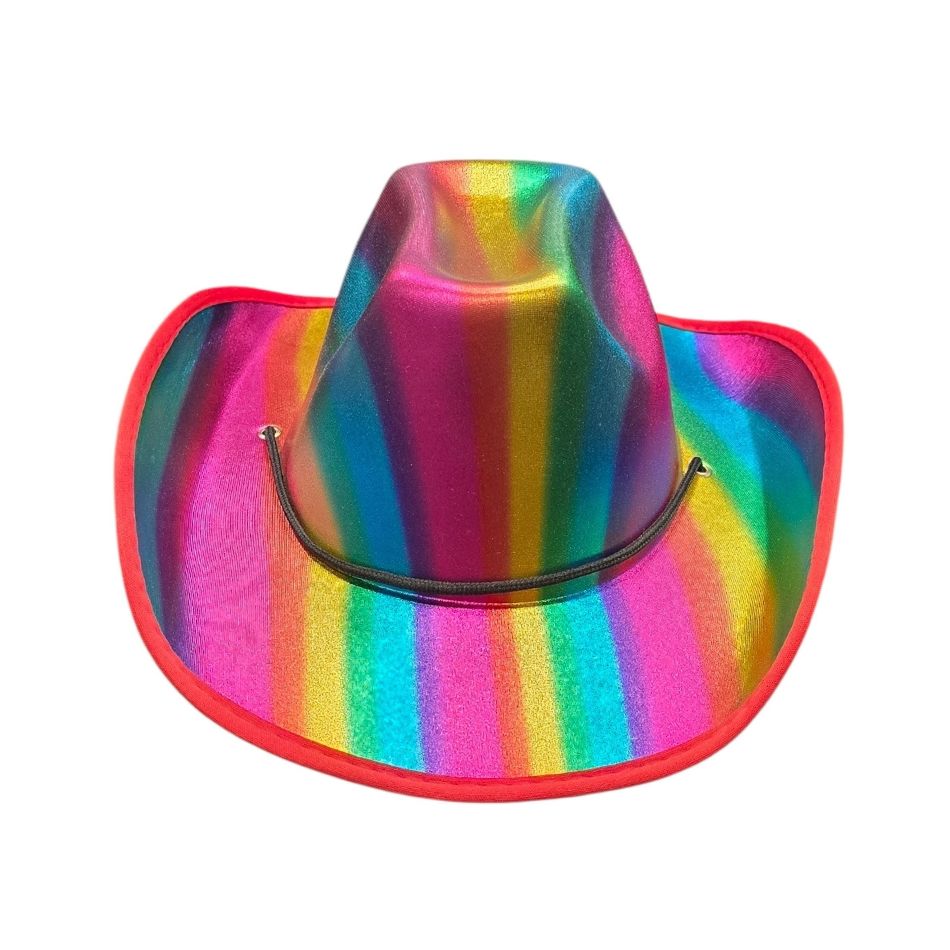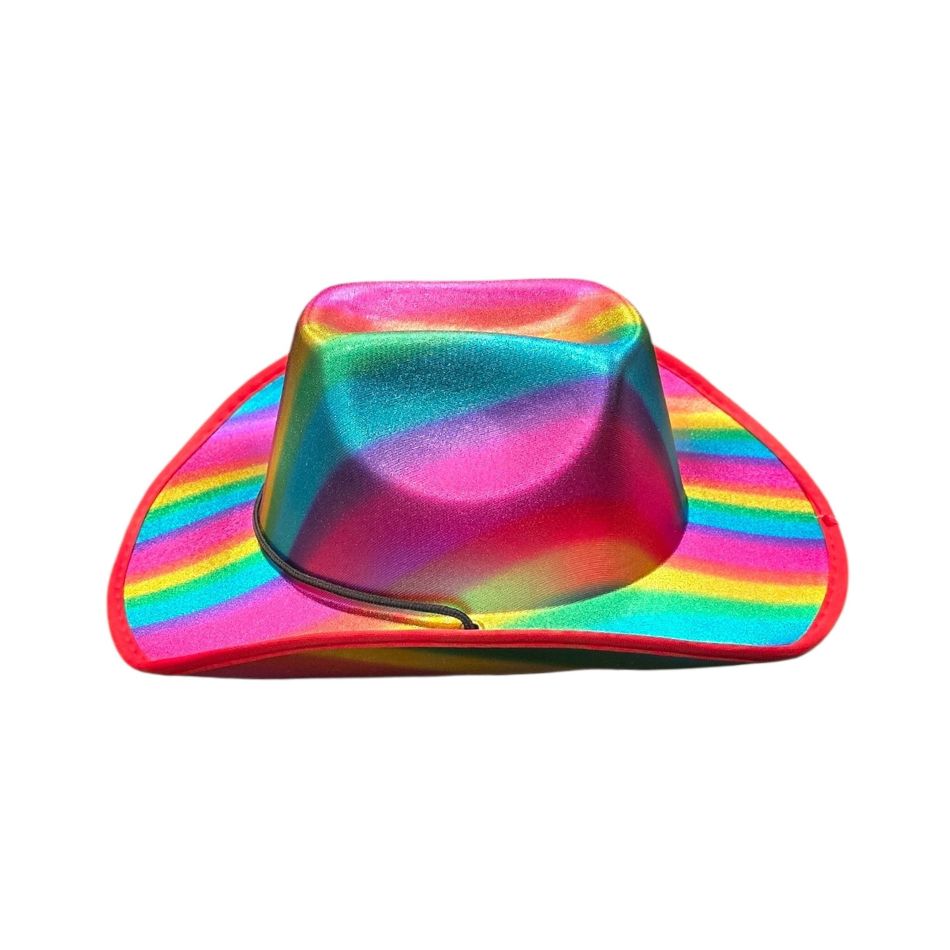 The striking Rainbow Cowboy Hat combines classic western style with vibrant, iridescent rainbow colors. Perfect for Halloween, themed parties, festivals and events where you want to stand out.