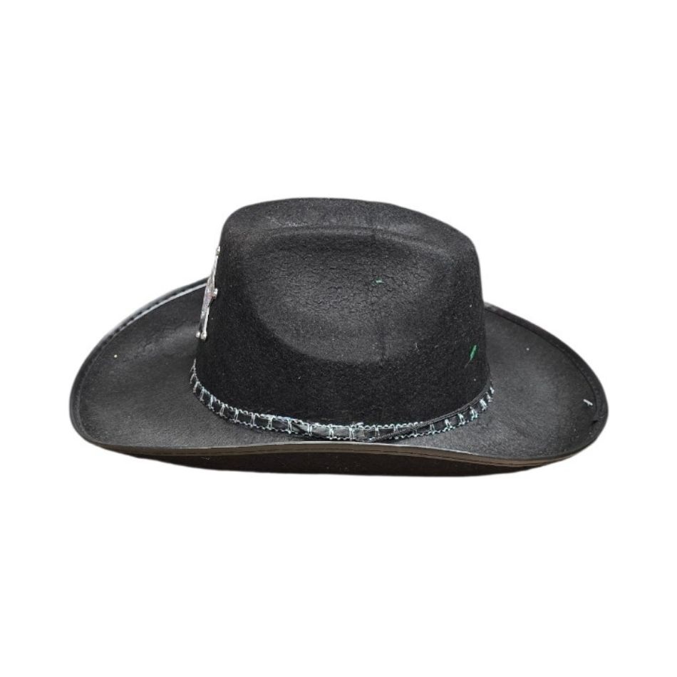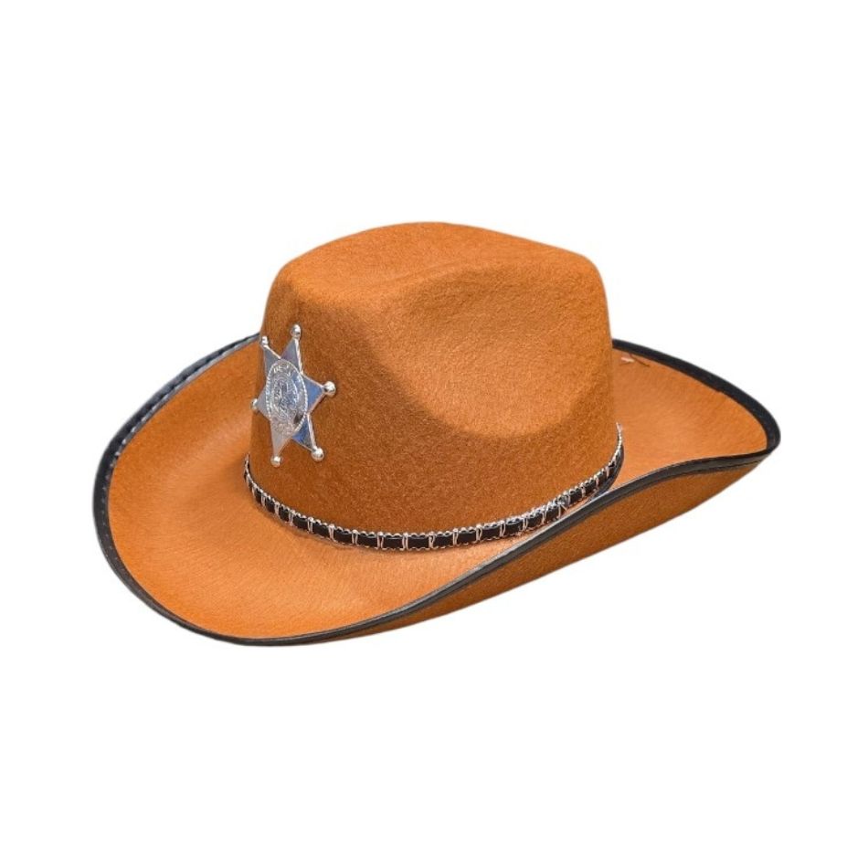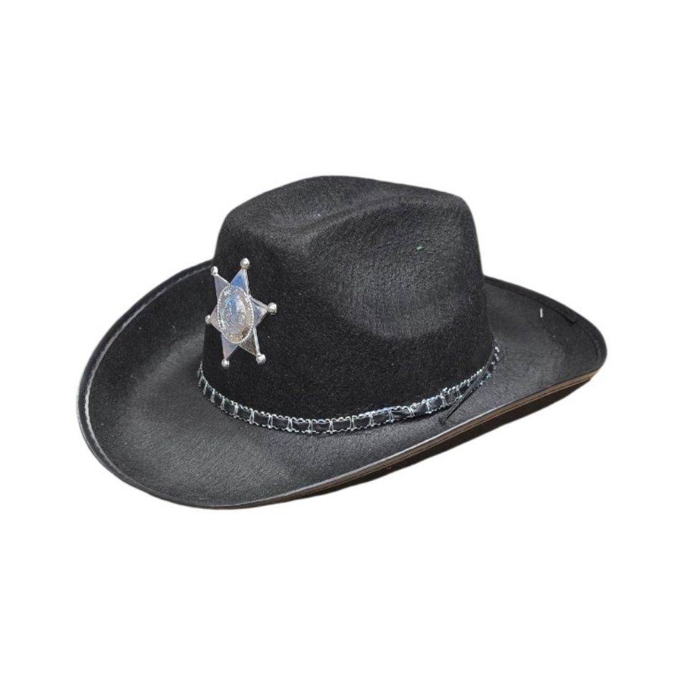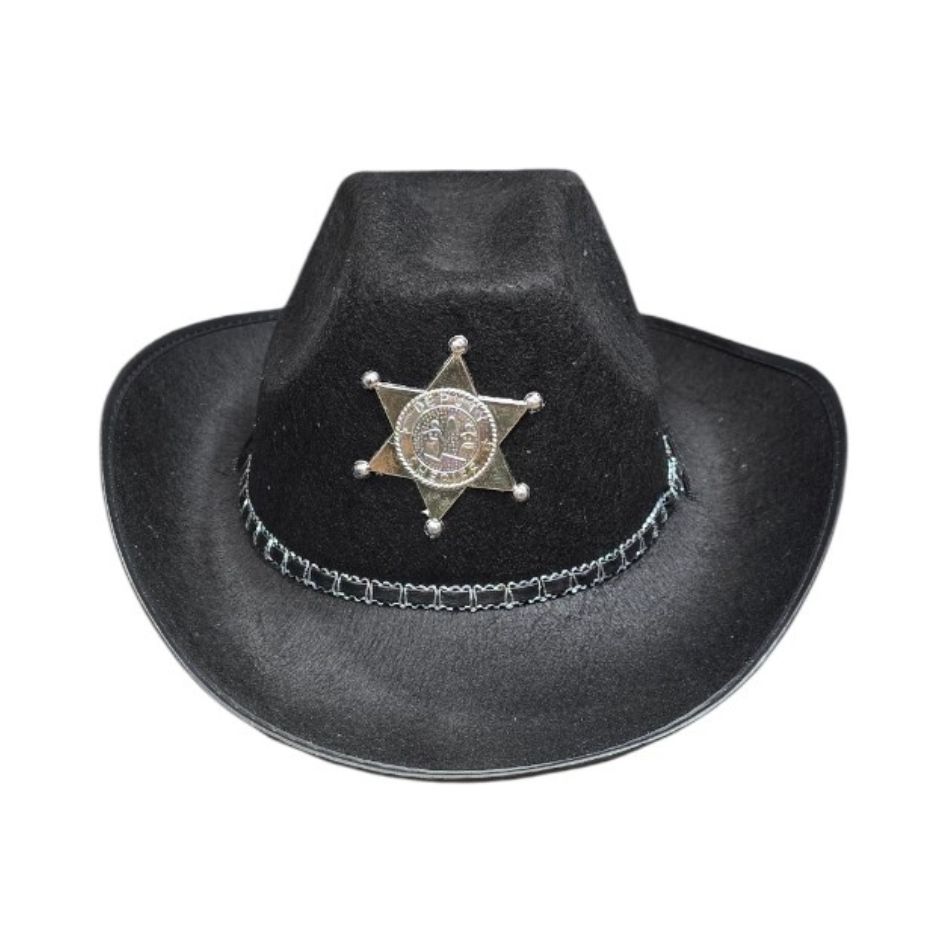 Classic cowboy sheriff hat with a metal star badge on the front and a decorative ribbon. Available in black and brown, ideal for Halloween, theme parties and performances.