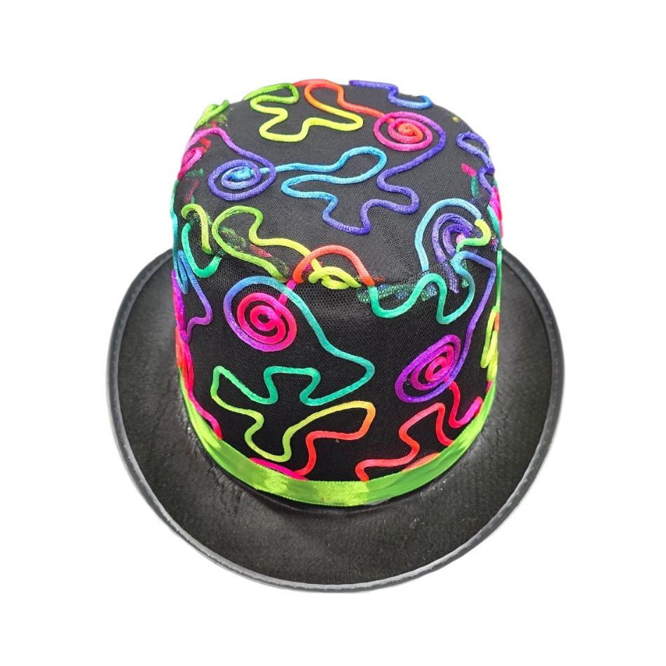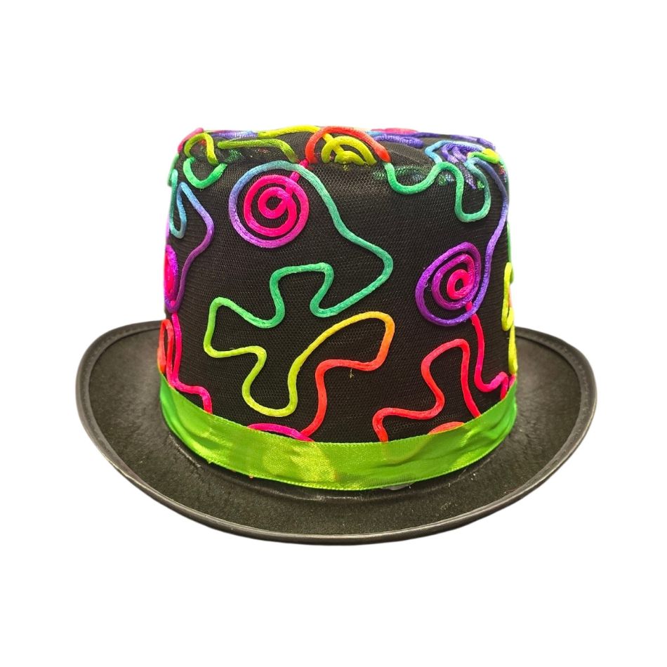 Bring color and fun to your look with this impressive top hat. The black background is decorated with embossed colorful designs in bright shades, creating a playful and distinctive effect that attracts all eyes.
