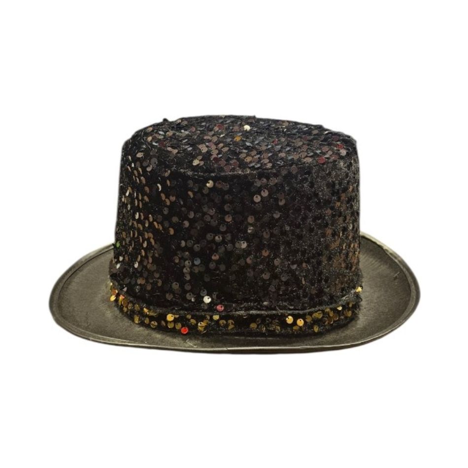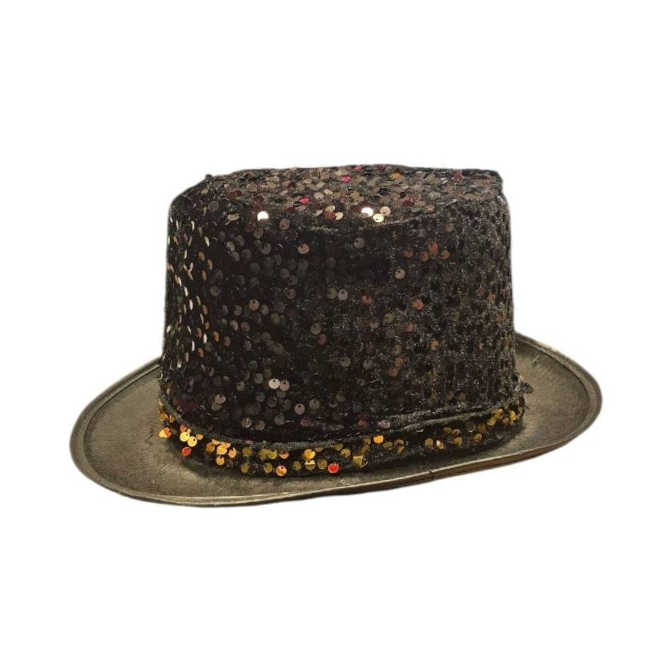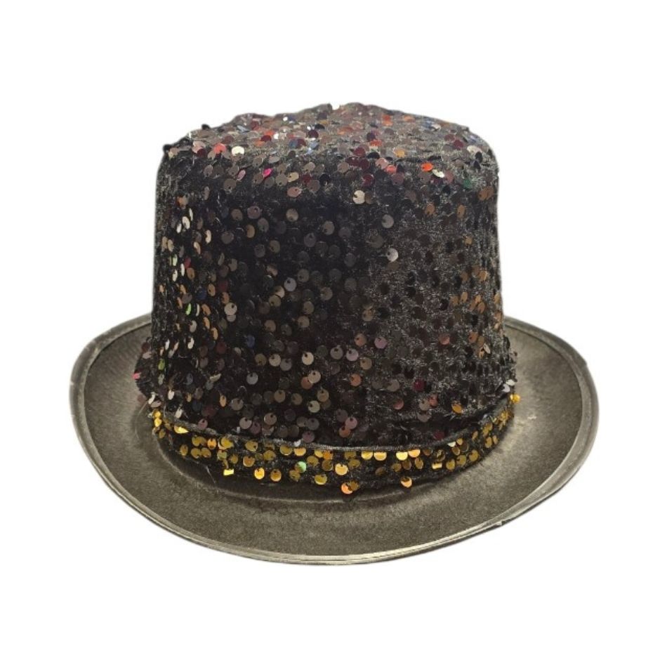 Sparkling top hat, covered in sequins for an impressive look. Ideal for parties, Halloween, theme nights and photo shoots. Available in black or gold.