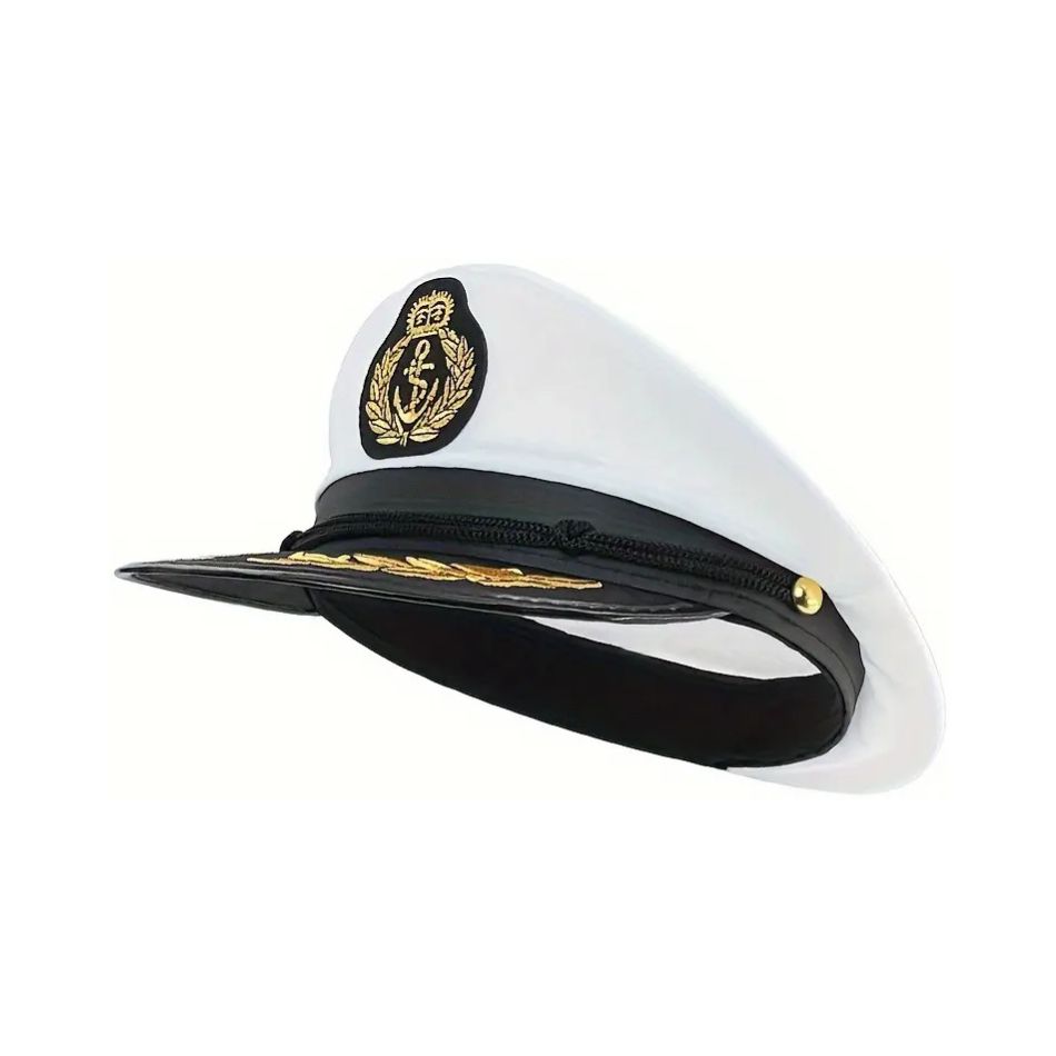 Upgrade your outfit with a hat that exudes prestige and nautical elegance. The classic white top is combined with a black brim and striking gold details, creating a look inspired by captains’ uniforms.