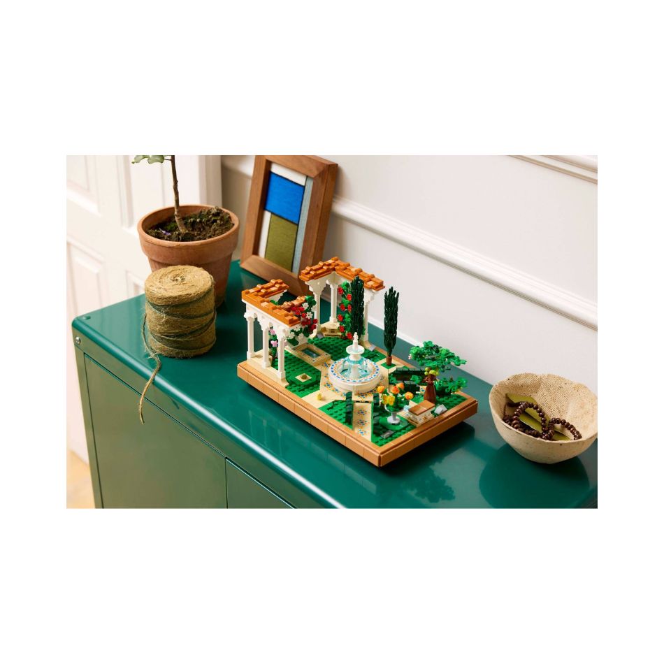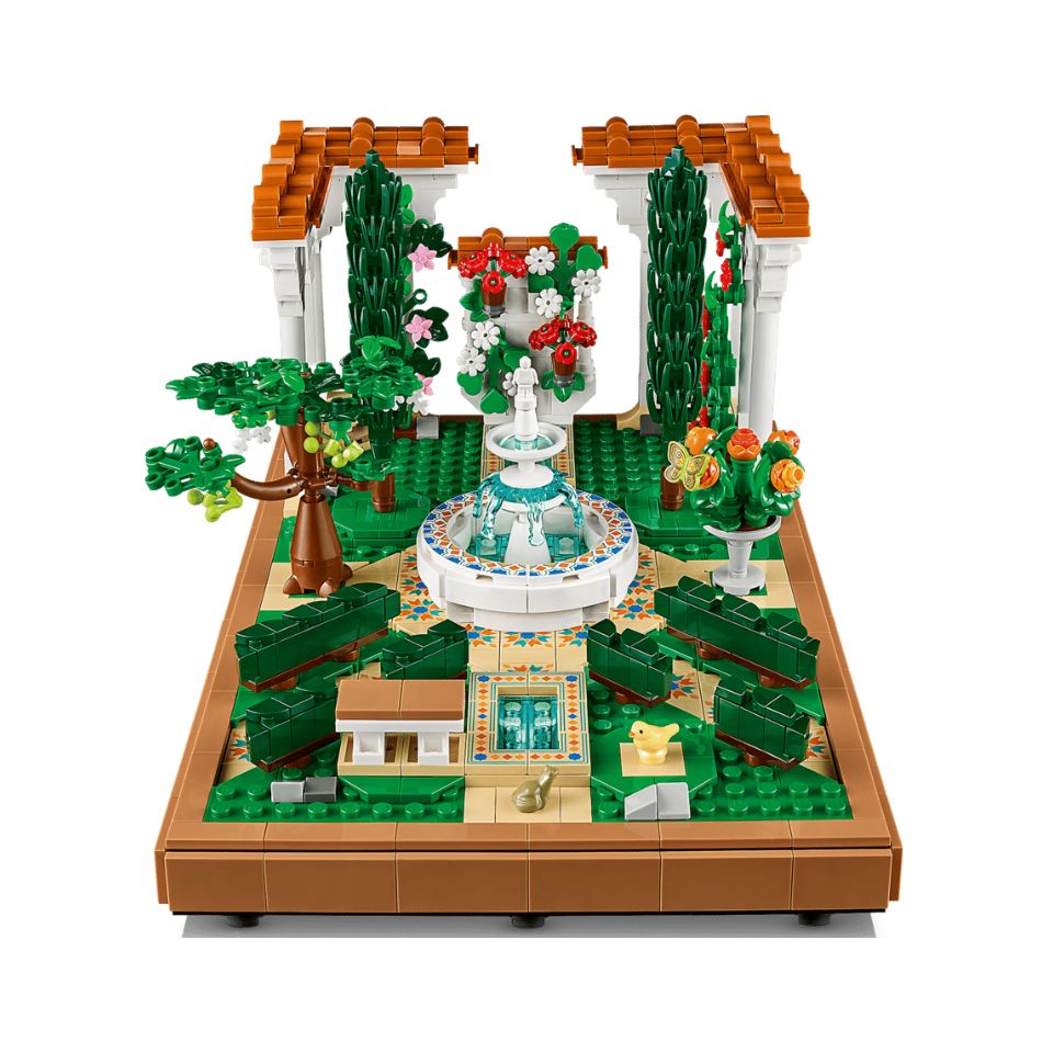 - What’s in the box – The LEGO® Fountain Garden features a tiered fountain, lavabo, 2 cypress trees, flowering grape vines, 4 pergolas and tiled pathways, plus luna moth, bird and frog figures