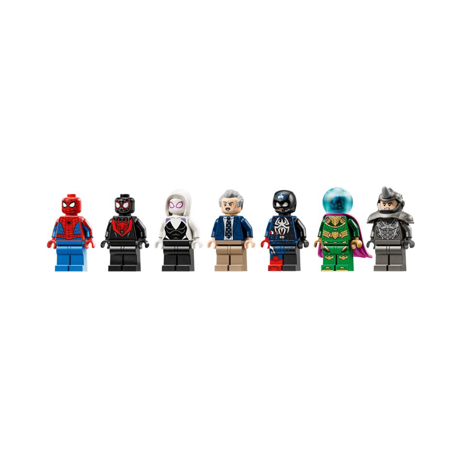 - 7 MINIFIGURES – Includes Spider-Man, Miles Morales, Ghost Spider, J. Jonah Jameson, Mysterio, Venomized Captain America and Rhino, plus a mech and 3 transparent posing sticks to enable mid-air action