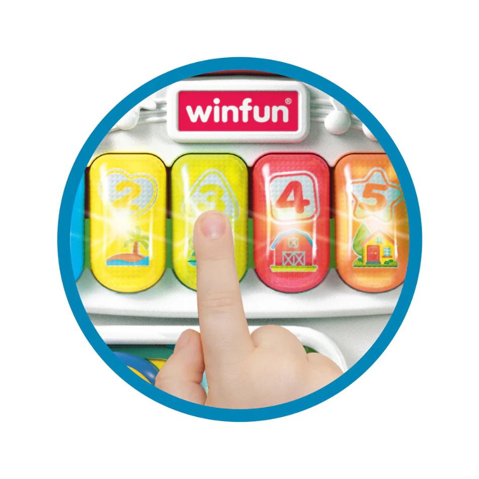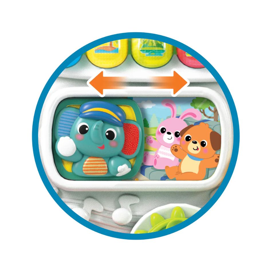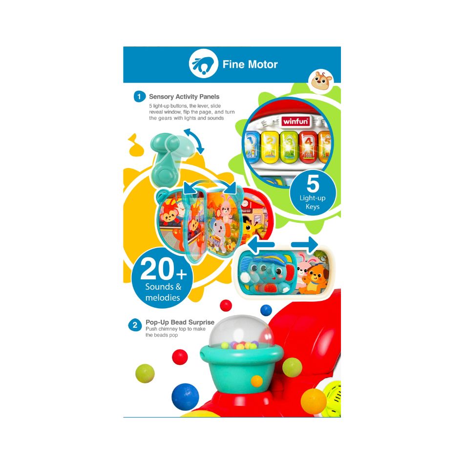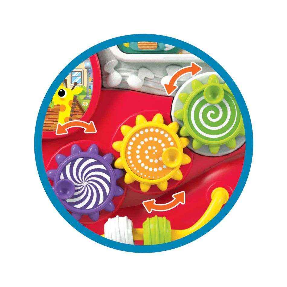 • 5 light-up buttons, push and pull the lever, slide reveal window, flip the page, and turn the gears with lights and sounds.