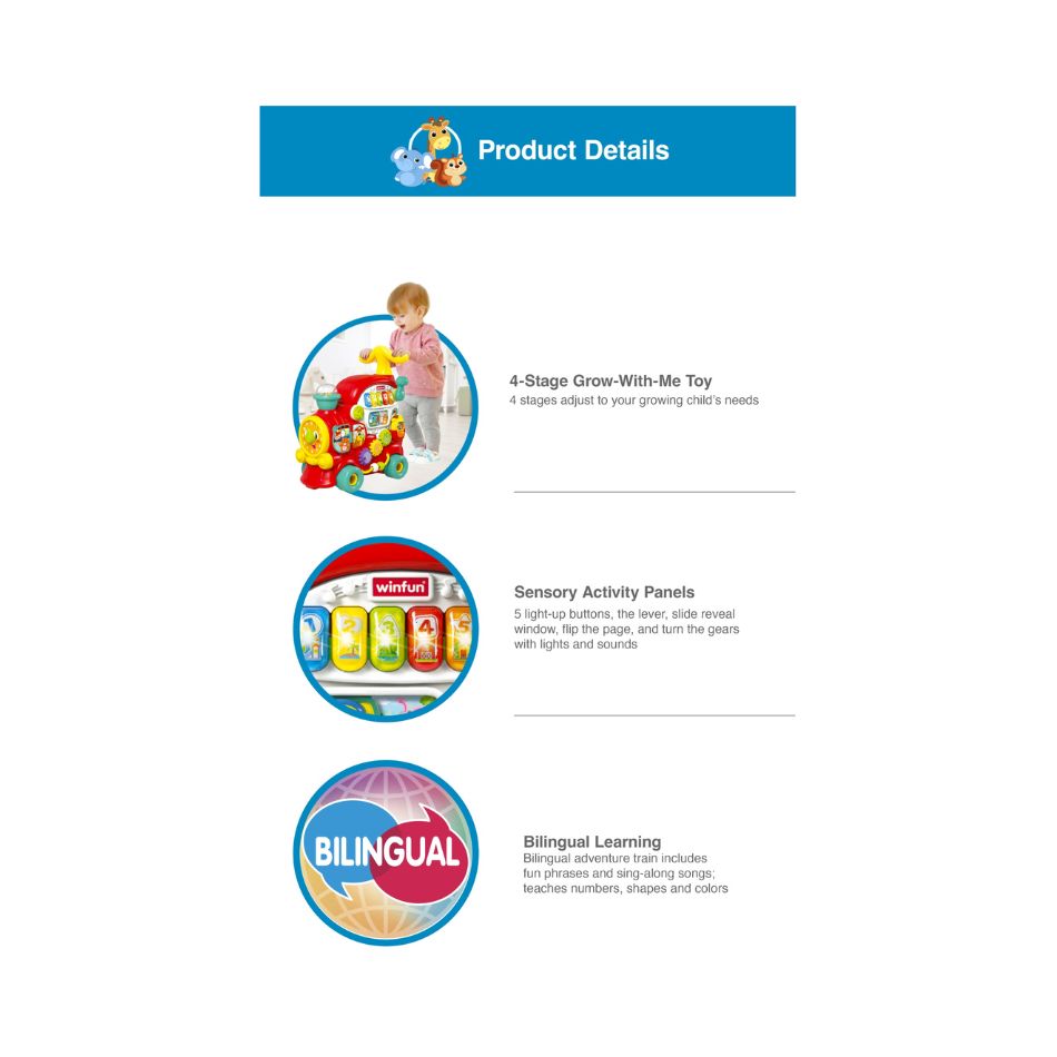 • Bilingual adventure train includes fun phrases and sing-along songs teaches numbers shapes and colors.