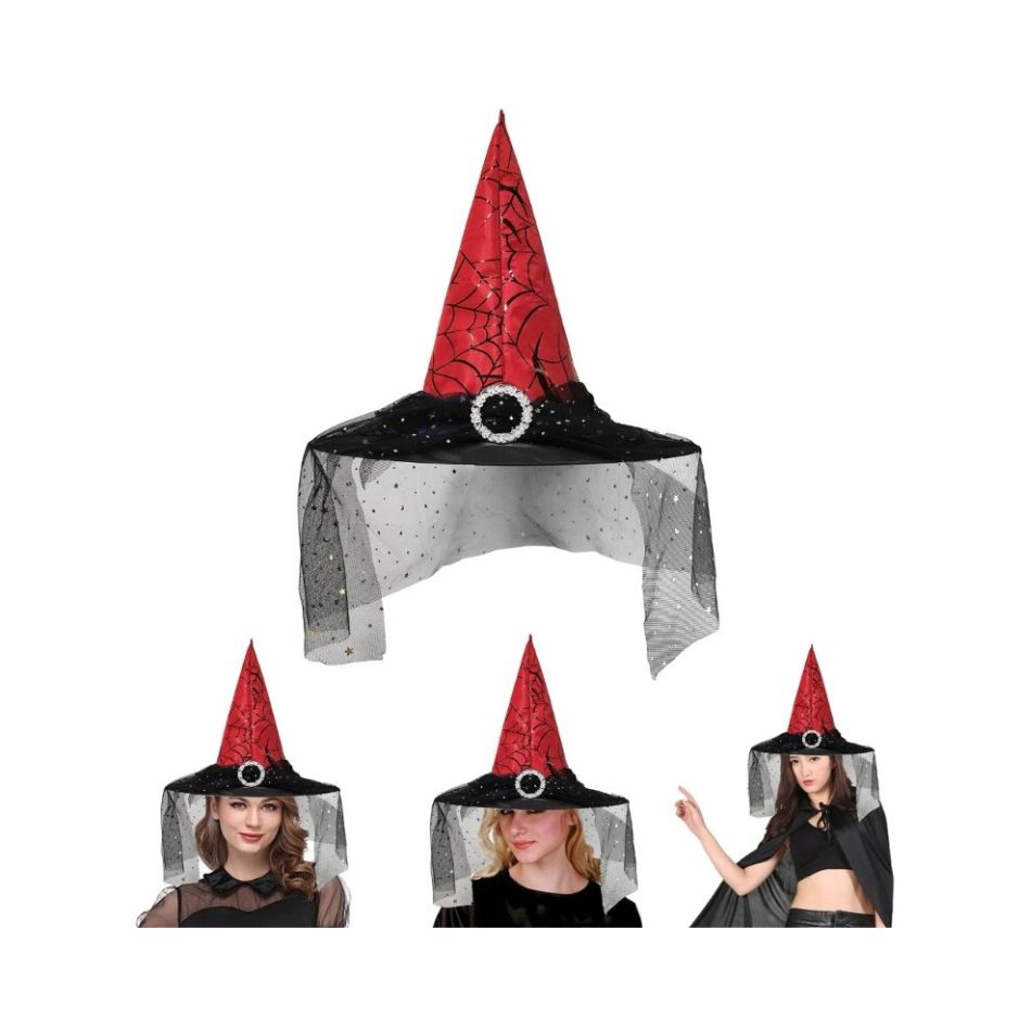Complete your costume with this spectacular witch hat. It features a tall pointed peak in red with a black spider web pattern, a wide brim and decorative black tulle with small gold details. The decorative buckle at the front adds extra carnival character. Ideal for Halloween, carnival, theme parties and school celebrations.